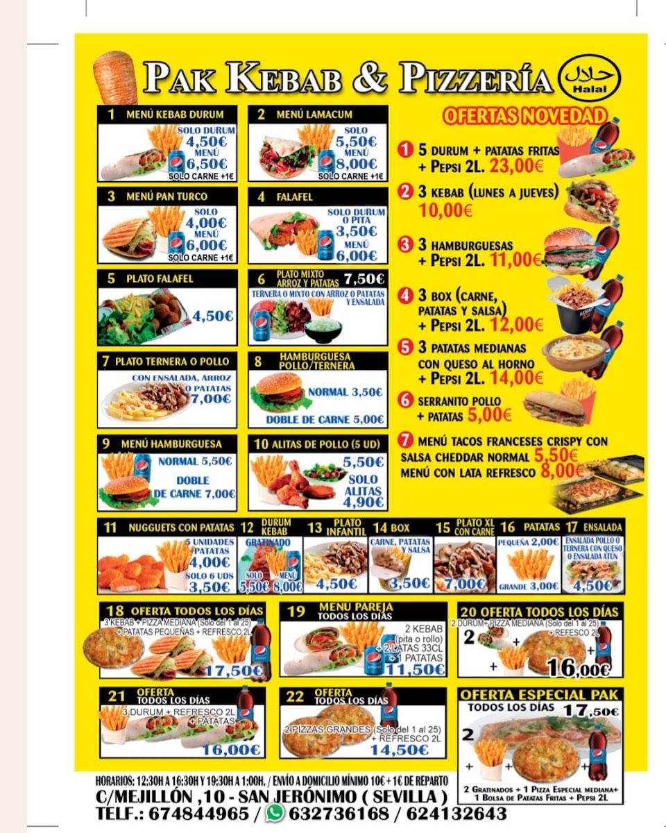 Pak Kebab &pizzeria in Sevilla offers a vibrant menu that masterfully combines fast food favorites with irresistible, home-style flavors. Their kebabs stand out for being richly seasoned and tender, delivering authentic taste that delights every bite. Accompanying the main dishes are perfectly cooked patatas fritas available in small or large portions, always served with their signature yogurt sauce, adding a creamy contrast.